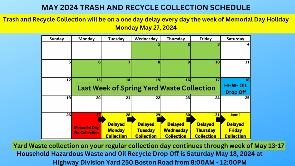There will also be a one day delay in trash and recycle collection due to the Memorial Day Holiday the week of May 27th.