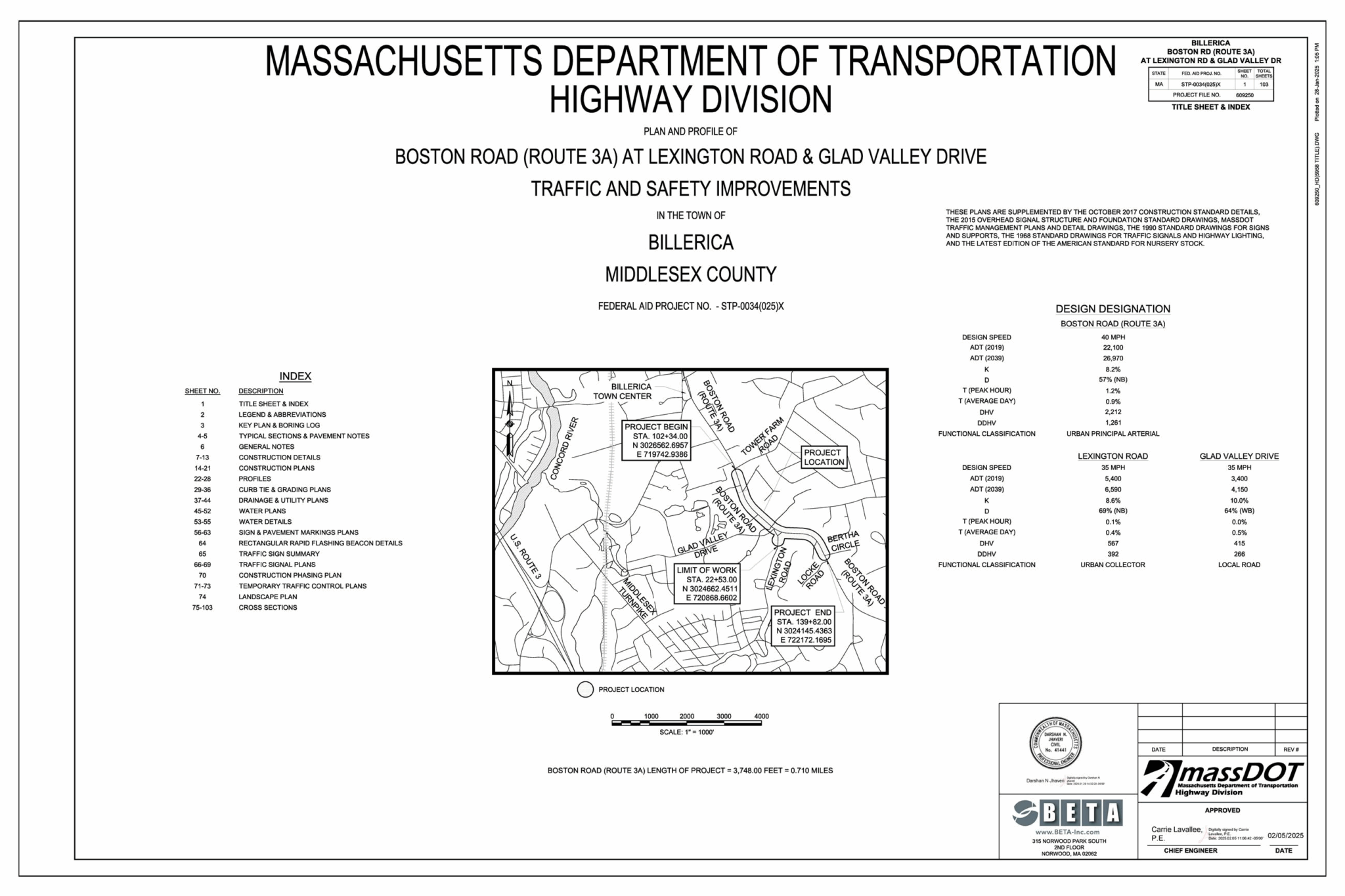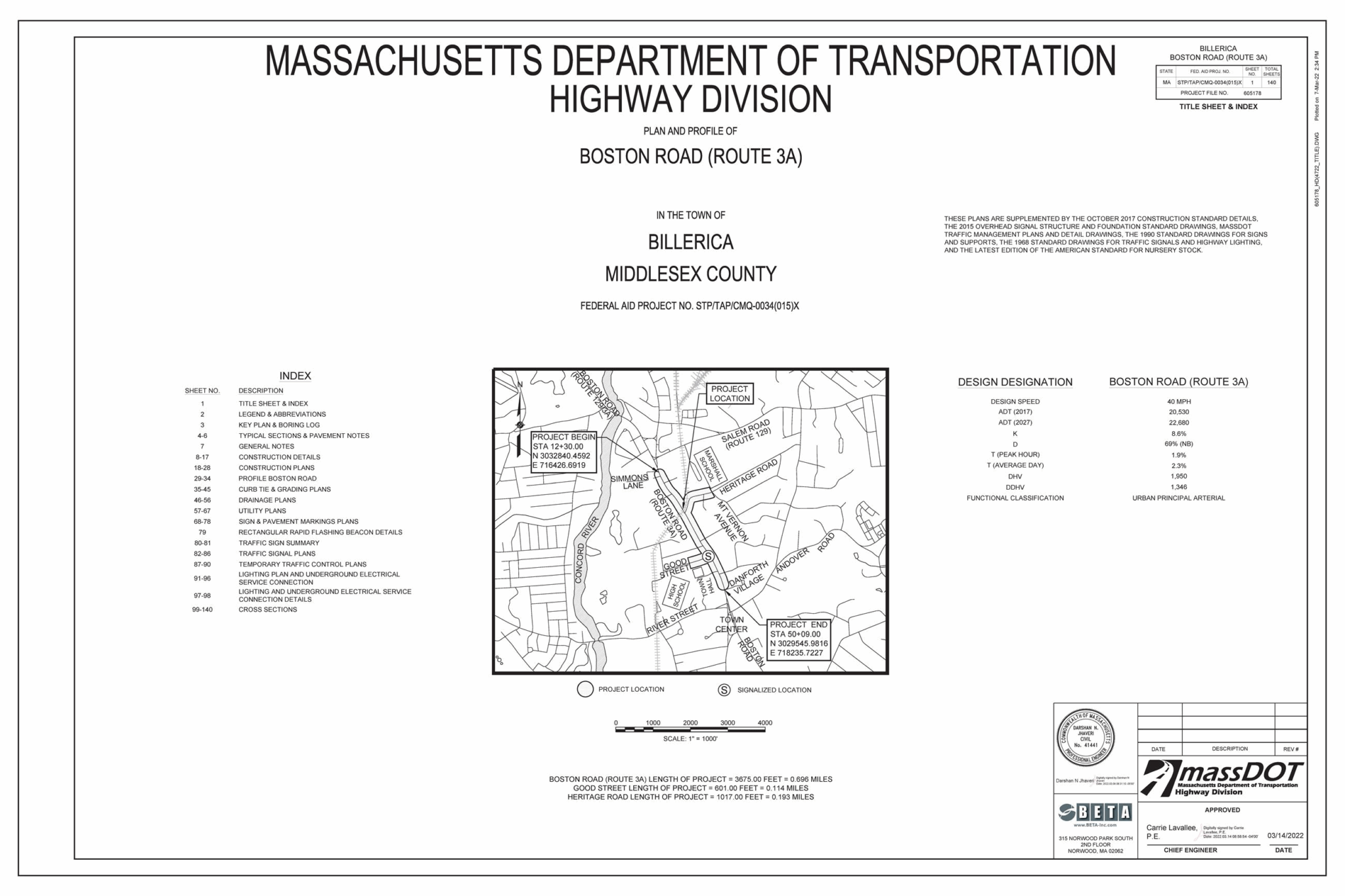 On July 31, 2023, The Town of Billerica and in conjunction with the Town’s Consultant, BETA Group, submitted the 100% Design Submittal to the Massachusetts Department of Transportation. This submittal was the result of extensive engineering and design work based on comments from MassDOT on the 25% and 75% submittal, comments received from the abutters at the Public Hearing, and from field investigation.