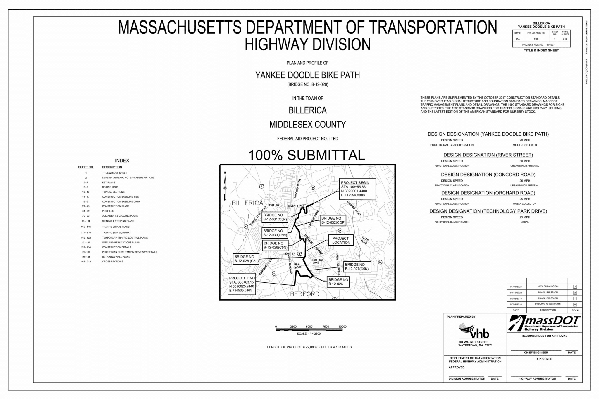 On January 5, 2024, the Town of Billerica, in conjunction with the Town’s Consultant, VHB, submitted the 100% Design Submittal to the Massachusetts Department of Transportation. This Submittal was the result of extensive engineering and design work based on comments received from MassDOT on the 25% and 75% Submittal, comments received from the public at the Public Hearing, and from field investigation at multiple locations.