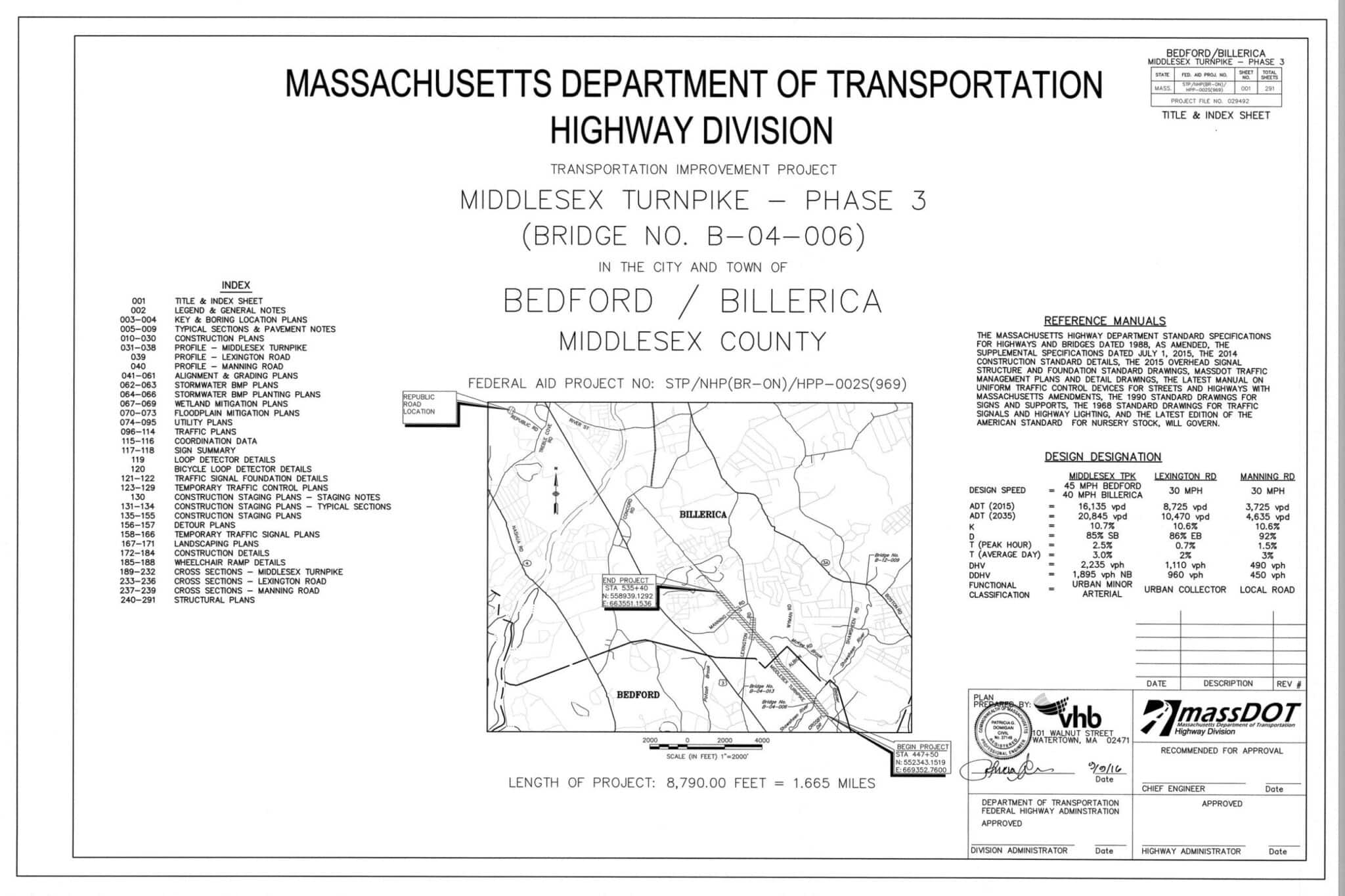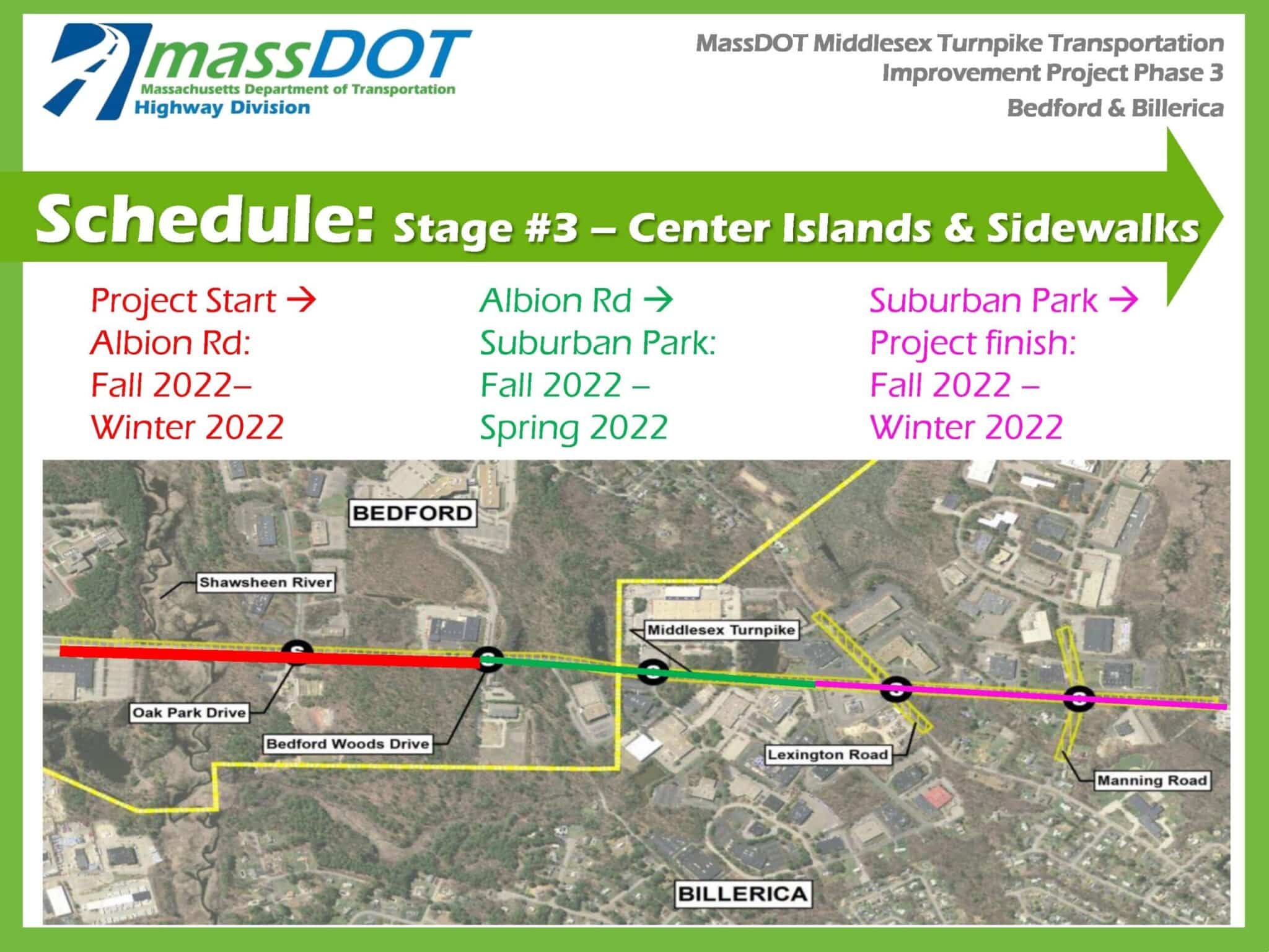 Construction on Phase 3 of the Middlesex Turnpike Roadway Improvement Project is ongoing. The project will be completed in sections as shown on the Schedule Plans below. During the project, two-way travel along Middlesex Turnpike will be in effect before 9:00 am and after 2:00 pm. Between 9:00 am and 2:00 pm, police details will limit traffic around the work crews to one travel lane at a time. Motorists driving through the corridor during the midday should expect a delay in travel time.